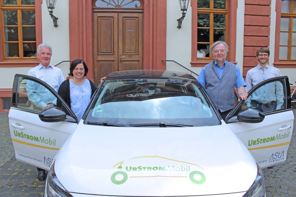 Grünewald präsentierte seinen neuen Dienstwagen im Hof des Bischöflichen Ordinariates Mainz am Donnerstag, 2. Juni, gemeinsam mit der Bevollmächtigten des Generalvikars, Ordinariatsdirektorin Stephanie Rieth, und den Vorständen der UrStrom eG, Dr. Philipp Veit und Dr. Gerhard Breuel.
