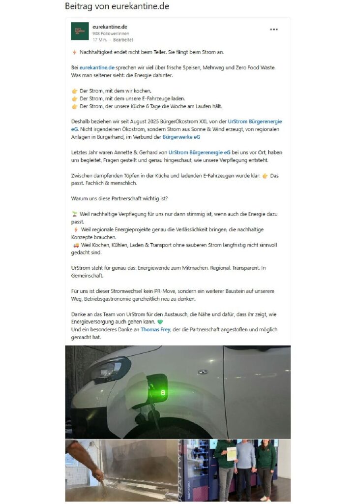 Auch eurekantine.de hat in den Sozialen Medien über die Zusammenarbeit mit der UrStrom eG berichtet: