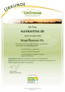 Mit diesem Gesamtkonzept war es nur folgerichtig, dass eurekantine.de zur UrStrom eG gekommen ist. Seit August 2025 bezieht das Unternehmen BürgerÖkostrom XXL von der UrStrom eG, der zu 100 % aus Erneuerbaren Energien stammt. „Das machen andere echte Ökostrom-Anbieter zwar auch”, erklärt die Bürgerwerke eG als Stromlieferant. „Das Besondere bei uns: Der Strom aus Sonne und Wind kommt aus regionalen Anlagen in Bürgerhand, die von unseren Mitgliedsgenossenschaften betrieben werden.” Für Jan Lang und Oliver Meiser ist dieser Stromanbieter-Wechsel „ein weiterer Mosaikstein, der unserer Vorstellung von einem verantwortungsvollen, umweltbewussten Unternehmen entspricht.”