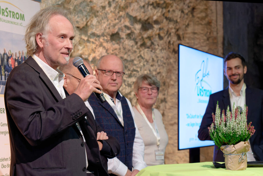 Mut machend angesichts des derzeitigen Gegenwinds aus Berlin war auch der Vortrag von Felix Schäfer. Als 24-Jähriger gründete er 2013 die Bürgerwerke eG mit, die heute bundesweiter Ökostromversorger und das größte Netzwerk von Energiegenossenschaften in Deutschland sind. Die UrStrom eG war übrigens Gründungsmitglied. „Die UrStrom eG war immer von Anfang an dabei, wenn es darum ging, gemeinsam mit anderen mehr zu erreichen”, erklärte er. „Damit steht ihr für mich wie keine andere Genossenschaft für Gründer:innengeist und für diese konsequente genossenschaftliche Überzeugung. Mit der Kraft der Bürgerenergie schaffen wir eine lebhafte, resiliente und zukunftsfähige Demokratie – von unten nach oben, von der Nachbarschaft in die Stadt, vom Land in den Bund.”